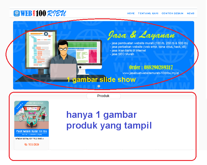 Tampilan Paket web 100 ribu yaitu 1 gambar slide show dan 1 gambar produk
